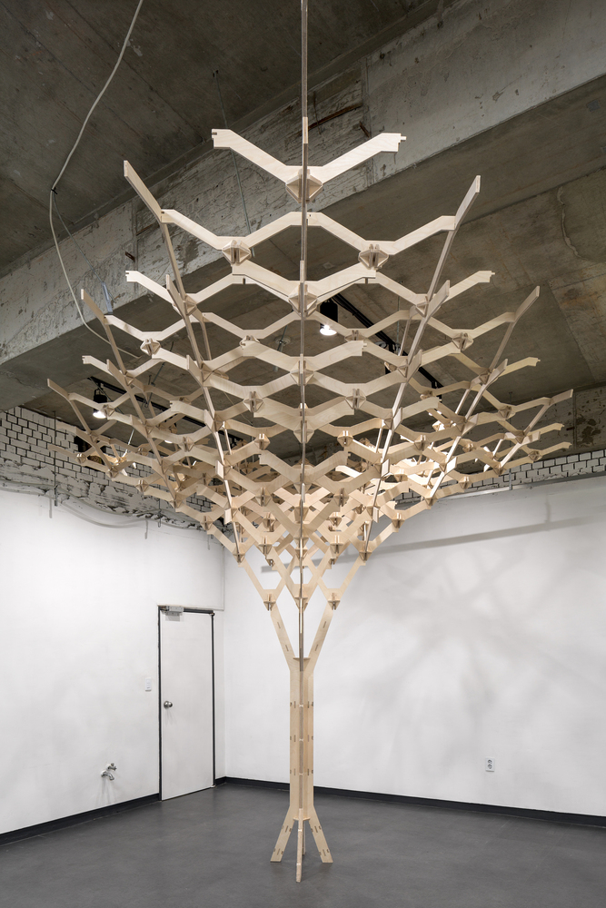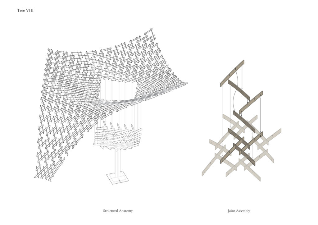 Text description provided by the architects: The “Tree Series” is a series of design projects that recreate the wooden bracket system of East Asian architecture. The system is the most iconic part of East Asian wooden buildings in both structural and aesthetic aspects. Structurally the system works in a critical capacity by connecting the roof structure, columns, and beams all together into a single system and by distributing the loads and assuring continuous load paths. Aesthetically the system gives three-dimensional effects through the complex assembly of wooden elements with joinery. The purpose of the “Tree Series” is to analyze the traditional bracket system and recreate it for the structure and fabrication process to be compatible with the contemporary industry of architecture. However, the “Tree Series” rejects a process called “modernization” of traditional architecture, which merely aims at the efficiency of construction and imitation of a traditional style. Rather, the “Tree Series” aims for a totally new, experimental, and radical rebirth of the traditional system.
